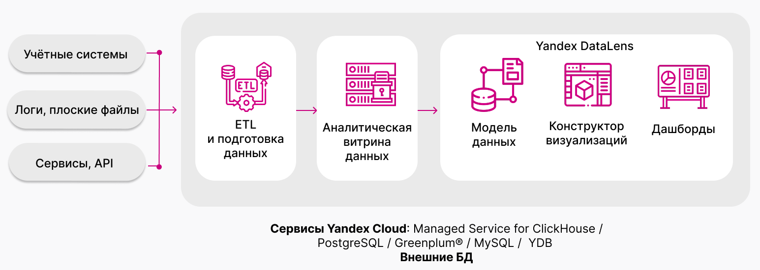 Архитектура DataLens включает подключение к различным источникам данных (базы данных, облачные хранилища), обработку данных с помощью SQL-запросов и визуального построения, создание моделей данных для упрощенного анализа, а также разработку интерактивных дашбордов и панелей мониторинга. Она обеспечивает управление доступом для безопасности, интеграцию с другими инструментами через API, и возможность использования машинного обучения для предсказательной аналитики.