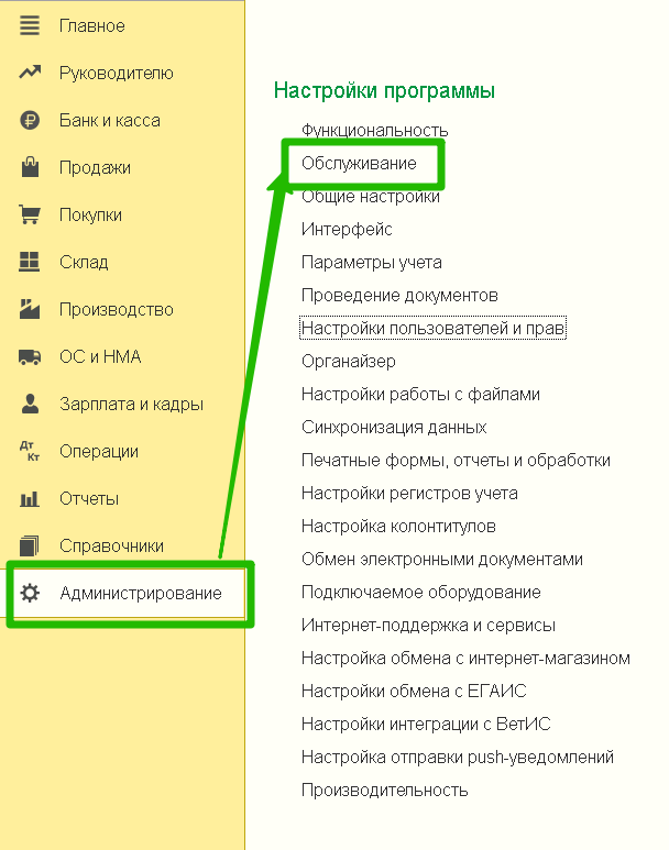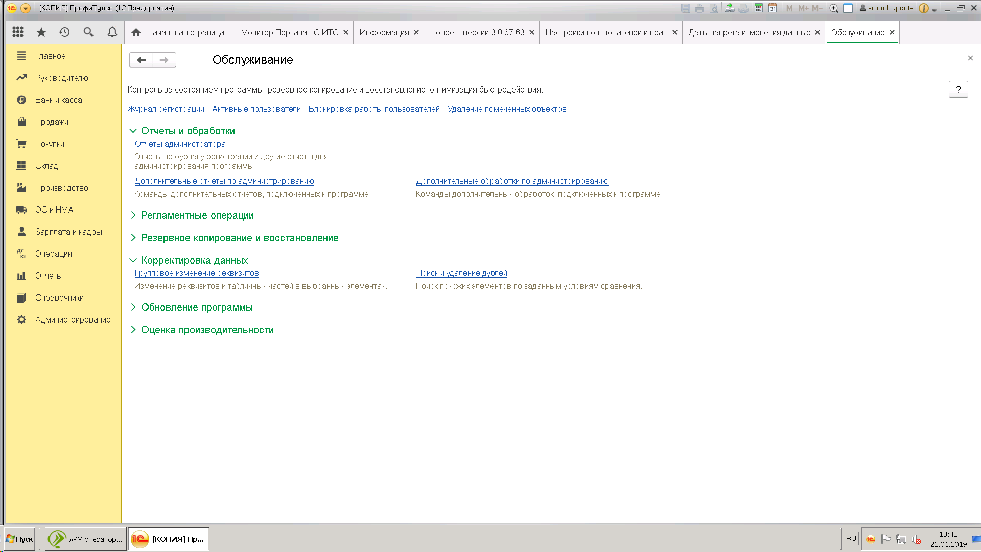 Важно! Перед тем, как произвести обработку, необходимо сделать резервную копию базы. Создать ее можно прямо в папке "Базы" либо достаточно будет зайти в раздел “Администрирование” и выбрать пункты "Обслуживание" – "Резервные копии и восстановление".