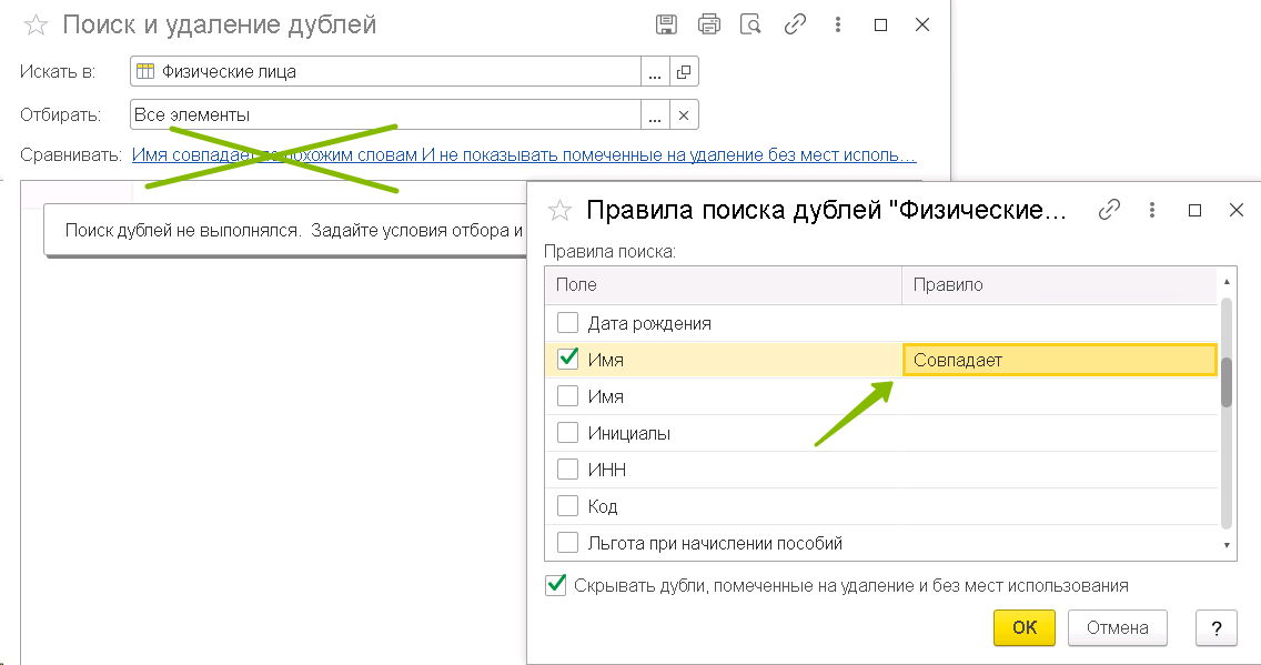 Особенно важно правильно задавать критерии, по которым будут отбираться элементы для поиска дублей. При обнаружении дублей среди физлиц программа по умолчанию установит критерий "Совпадает по похожим словам" (неполное совпадение реквизитов). Таким образом программа примет за дубли физических лиц с идентичными фамилиями и почистит одних, заменив на другие. Чтобы этого избежать, поменяйте критерий вручную на "Совпадает" (полное совпадение ФИО).