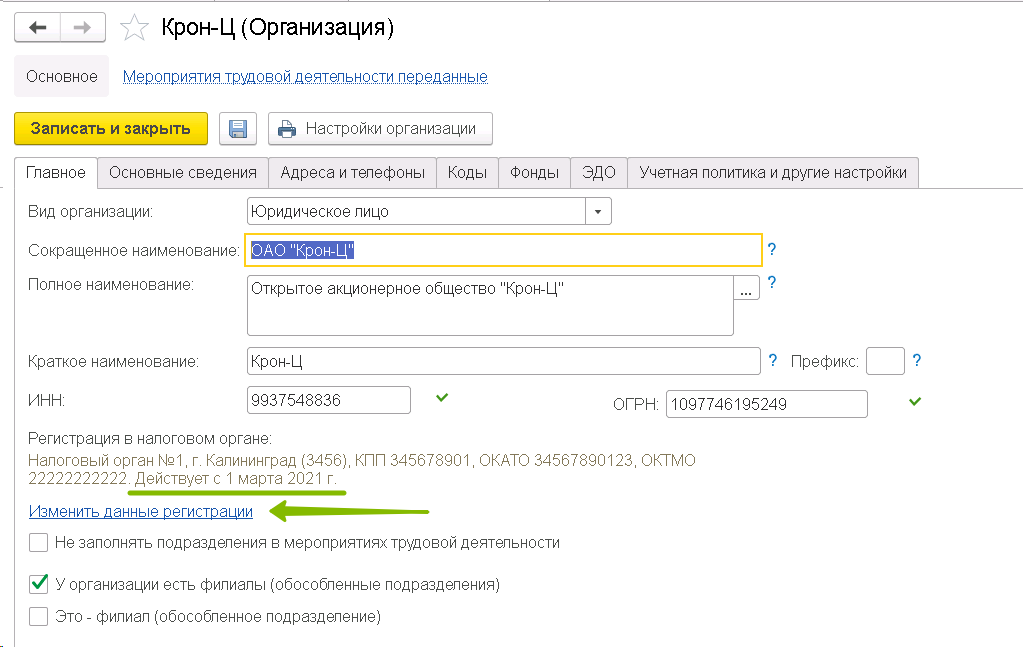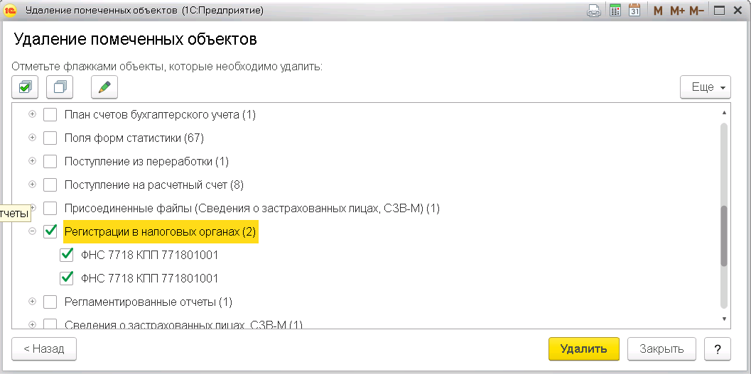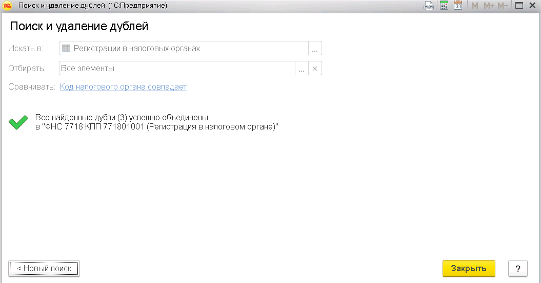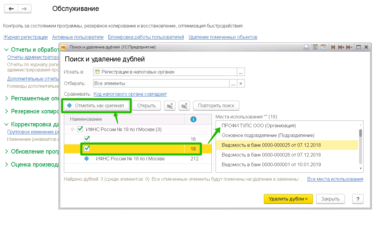 Нажав кнопку "Удалить дубли", на основной элемент будут перенесены все ссылки из объектов информационной базы, а дубли будут помечены на удаление. В случае с удалением ИФНС и организаций, первая попытка может быть безрезультатной, поскольку останется один объект, который будет препятствовать завершению переназначению ссылок и дубли не удалятся. Можно изменить основной элемент на другой и попробовать повторить операцию. В рассматриваемом нами примере вручную выбираем как основную ту регистрацию, к которой привязана наша организация.