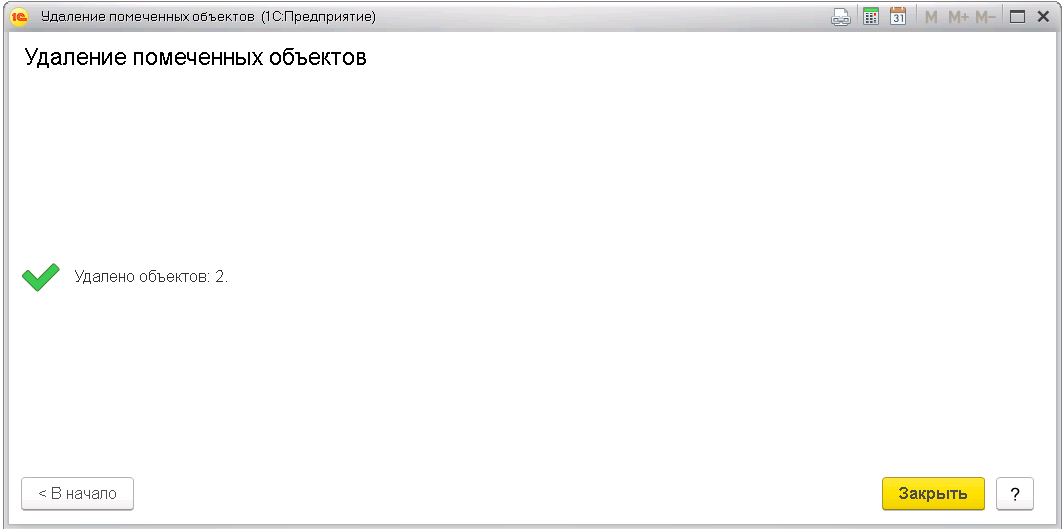 Теперь переназначение ссылок завершено, а на оставшиеся без привязок задвоенные объекты установлены пометки на удаление. Удалить их можно через "Администрирование" – "Удаление помеченных объектов".