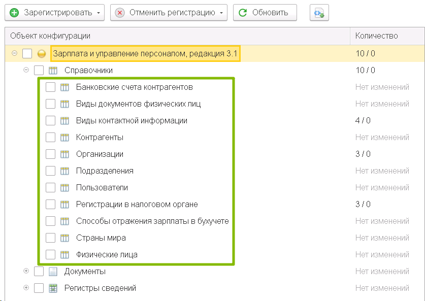 Несмотря на указание новой даты обмена, все отправляемые данные, имеющиеся в данном периоде только на этом основании не будут автоматически включены в обмен. Нужно сделать это вручную по порядку. В ЗУП переходим по ссылке "Состав отправляемых данных". Выберите необходимый тип документов и в верхнем углу слева нажмите "Зарегистрировать", указывая отбор документов, подлежащих отправке. Это может быть один объект, все или выбираем по своему критерию.