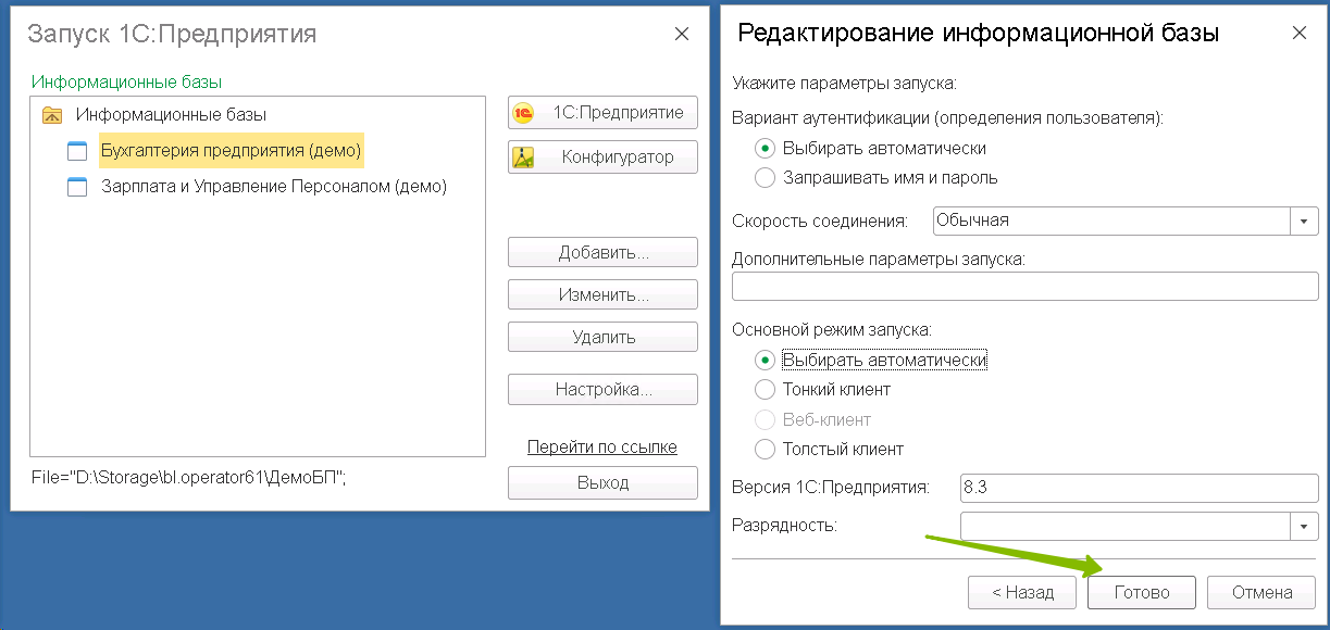 Данную проблему можно решить следующим способом. Следует перейти в общее меню, в окне выбора базы нажать на кнопку Бухгалтерии, затем выбрать "Изменить" и нажать во всплывающих окнах опции "Далее" и "Готово". После этого вновь вернуться в стартовое меню.