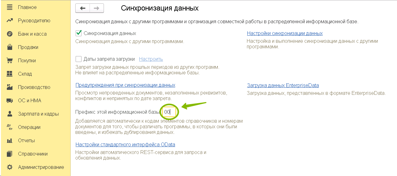 В настройках данных обмена следует уточнить префикс БП: "Администрирование - Синхронизация данных". Если данное поле окажется пустым, нужно в него добавить "00" и нажать "Enter".