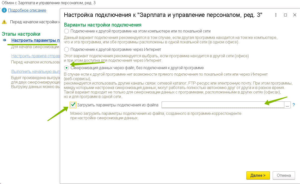 В Бухгалтерии на этапе "Правила настройки подключения" при настройке через каталог была проигнорирована установка флага "Получить настройки подключения из файла", а также не был выбран файл настроек, созданный программой ЗУП в папке обмена.