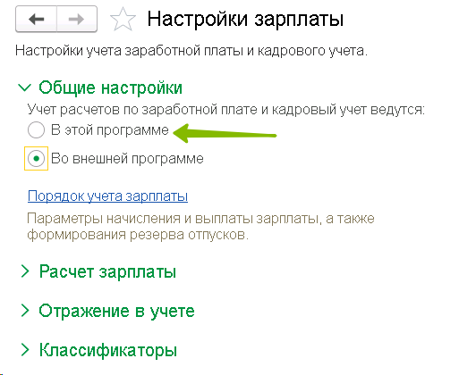 Посмотреть документы, действующие на момент учета в Бухгалтерии, нужно перейти во вкладки "Зарплата и кадры" – "Настройки зарплаты" и выбрать режим "В этой программе".