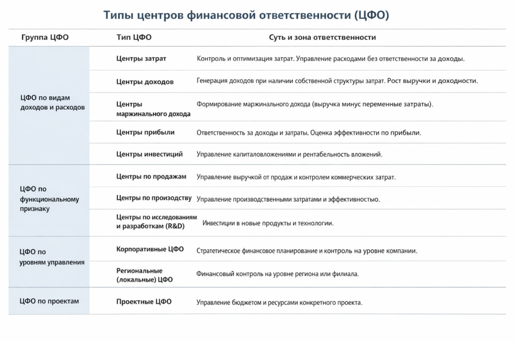 • Типы ЦФО подбираются под модель бизнеса и управленческие задачи — универсальной схемы не существует.