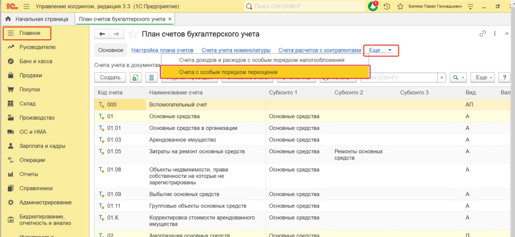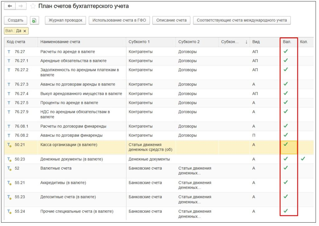 Список счетов с признаком валютного учета в 1С:ERP