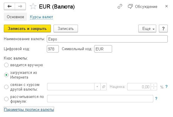 Карточка валюты в 1С Бухгалтерия