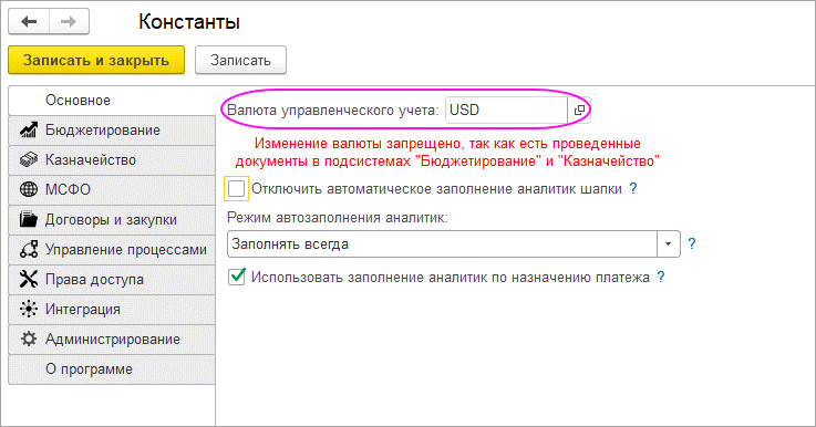 Базовым элементом настройки является валюта управленческого учета, которая задается в разделе «Константы (БИТ)». Именно в этой валюте, наряду с валютой операции, валютой регламентированного учета и валютой сценария, ведется учет и формируются управленческие отчеты. В качестве валюты управленческого учета может быть выбрана любая валюта из справочника «Валюты». После проведения документов бюджетирования и казначейства изменение валюты управленческого учета становится недоступным, что обеспечивает сопоставимость данных в динамике.