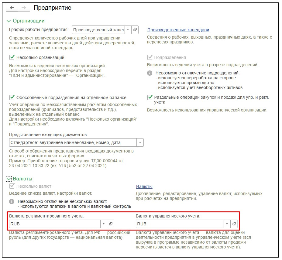 В программе используются две ключевые валюты: валюта регламентированного учета и валюта управленческого учета. Валюта регламентированного учета соответствует требованиям закона № 402-ФЗ и применяется для пересчета всех валютных операций в рубли. Валюта управленческого учета может быть выбрана произвольно и используется для управленческого анализа. Оба параметра настраиваются централизованно в разделе «НСИ и администрирование» и действуют сразу для всех организаций в одной информационной базе.