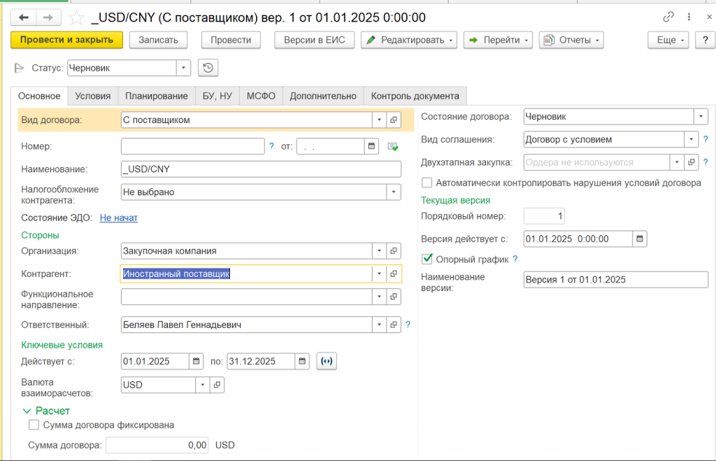 Ключевым объектом учета является валютный контракт, который фиксирует обязательства компании в иностранной валюте. Контракт создается в справочнике договоров с указанием контрагента, валюты договора, суммы, сроков действия и условий расчетов. Именно валютный контракт становится основой для всех последующих операций — платежей, поступлений товаров и услуг, а также расчета курсовых разниц.