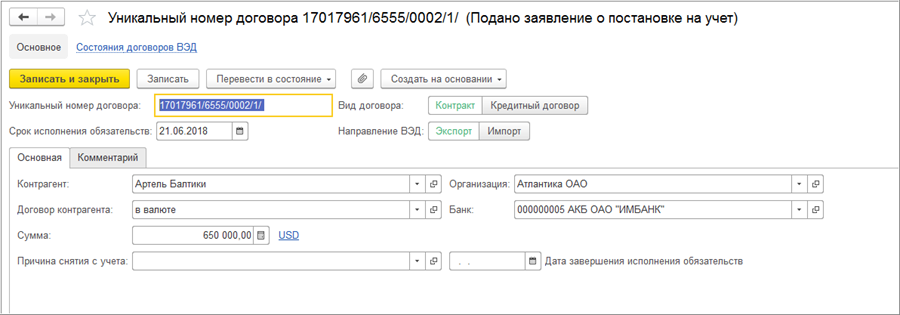 Учет внешнеэкономических контрактов ведется в справочнике «Регистрация договоров ВЭД», где фиксируются уникальные номера контрактов (кредитных договоров), валюта договора, сумма, обслуживающий банк, контрагент и другие параметры. Использование статусов регистрации позволяет отслеживать текущее состояние договора — постановку на учет, внесение изменений, снятие с учета и другие этапы жизненного цикла контракта.