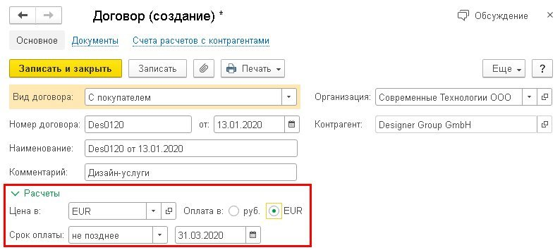 Карточка договора в валюте в 1С Бухгалтерия