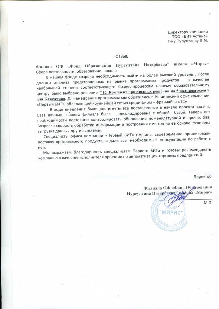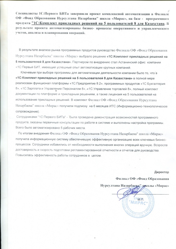 Подтверждение об автоматизации бухгалтерского учета в Филиале Общественного Фонда «Фонд Образования Нурсултана Назарбаева» детский сад «Мирас» на базе программного продукта: «1С:Предприятие 8. Бухгалтерия для Казахстана «1С:Предприятие 8. Зарплата и...