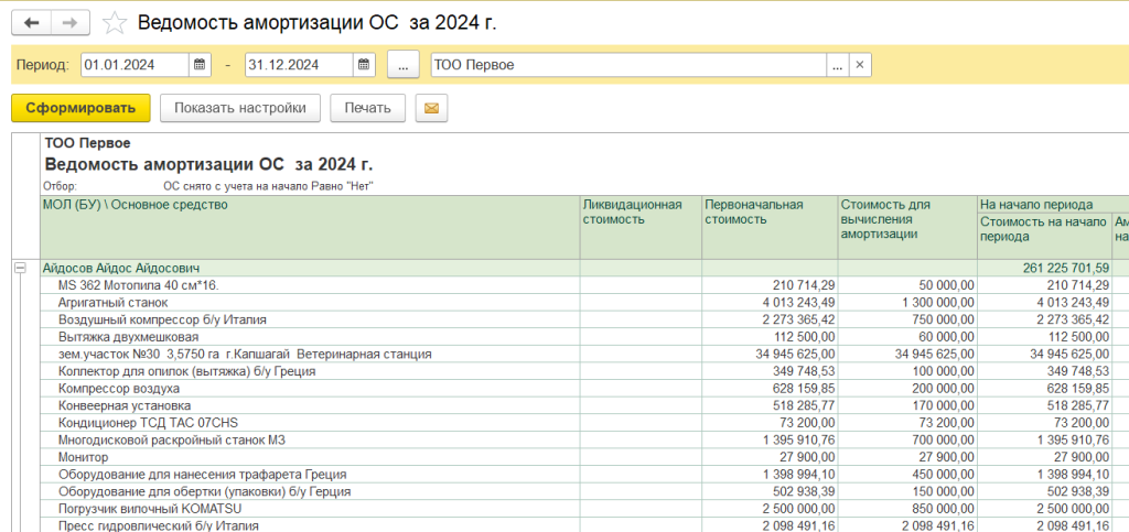 Для анализа первоначальной и остаточной стоимости и накопленной амортизации по объектам основных средств в бухгалтерском и налоговом учете сформируем отчет Ведомость амортизации ОС в программе 1С:Бухгалтерия для Казахстана (рис. 1):