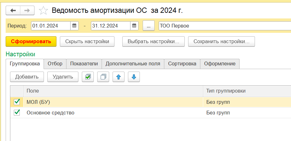 - на закладке Группировка выбираются параметры, по которым будут сгруппированы основные средства в отчете (по МОЛ, по Организации и др.) (рис.2);