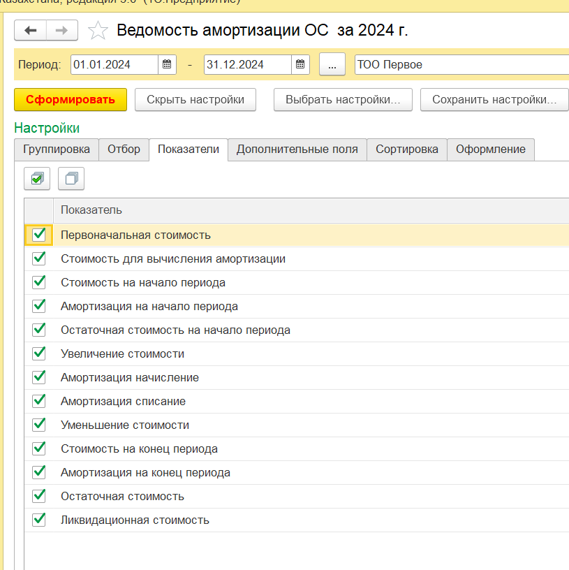 Для анализа первоначальной и остаточной стоимости и накопленной амортизации по объектам основных средств в бухгалтерском и налоговом учете сформируем отчет Ведомость амортизации ОС в программе 1С:Бухгалтерия для Казахстана (рис. 1):