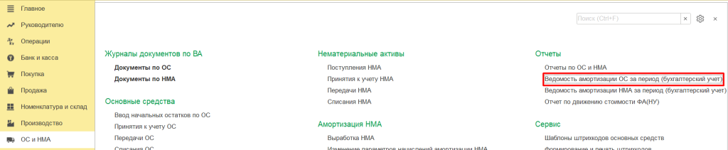- Раздел: ОС и НМА — Ведомость амортизации ОС.
