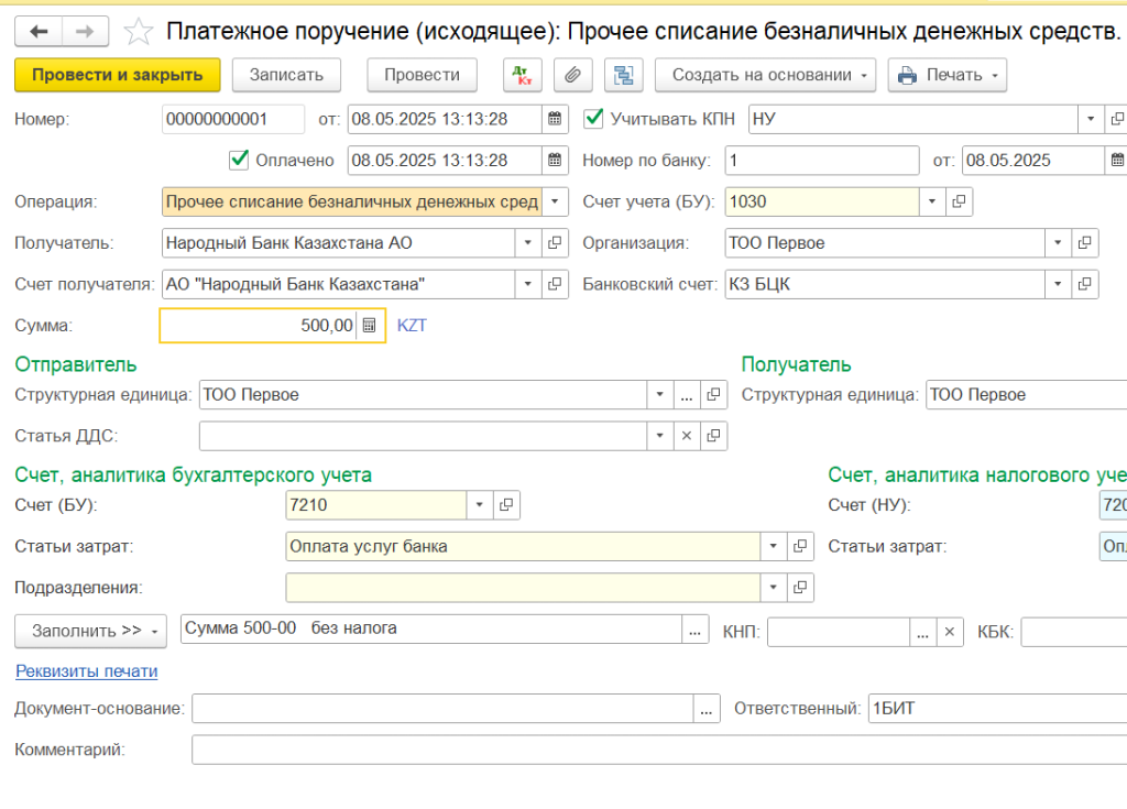В программе 1С:Бухгалтерия для Казахстана в документе Платежное поручение (исходящее) (раздел Банк и Касса - Банк) выставить вид операции «Прочее списание безналичных денежных средств». (рис. 1):